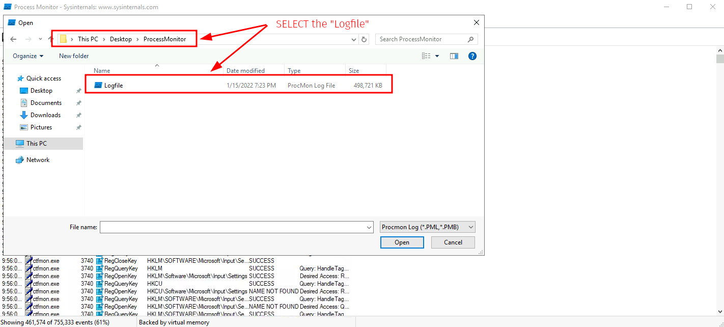 and then by selecting the "Logfile" which is placed in the "ProcessMonitor" folder on our Desktop.