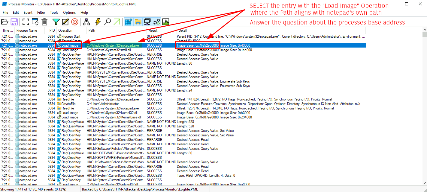 Here, since we are looking for the base address of the "notepad.exe", we are going to search for the event where the "notepad.exe" program was loaded. Take note of the Operation Field of the event, which is "Load Image" and the full Path for our executable. We can find the "Image Base" either under the event's "Detail" Field, or by opening it's properties.