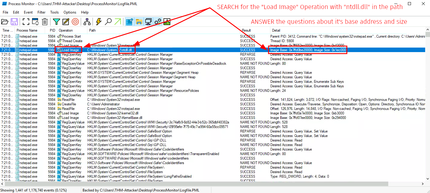 Given the previous tasks, we already did just that, so nothing to do here. As for the next two questions, we could either filter again by Operation and specify "Load Image" as our target and then search for "ntdll.dll", or simply look for it, it's the 4th event associated with the "notepad.exe" program.