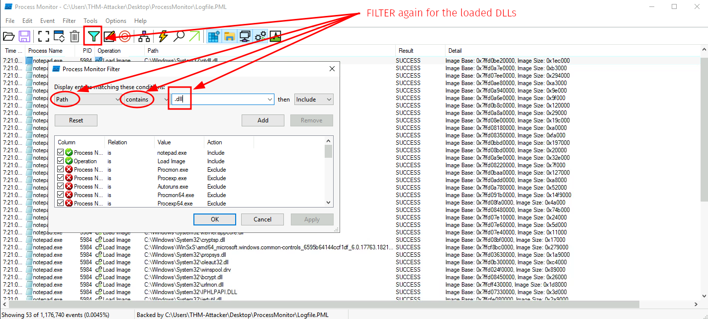But since we are only interested with loads, where a DLL was loaded, we filter for it by specifying that the "Path" must contain ".dll" which specifies the DLLs extension.