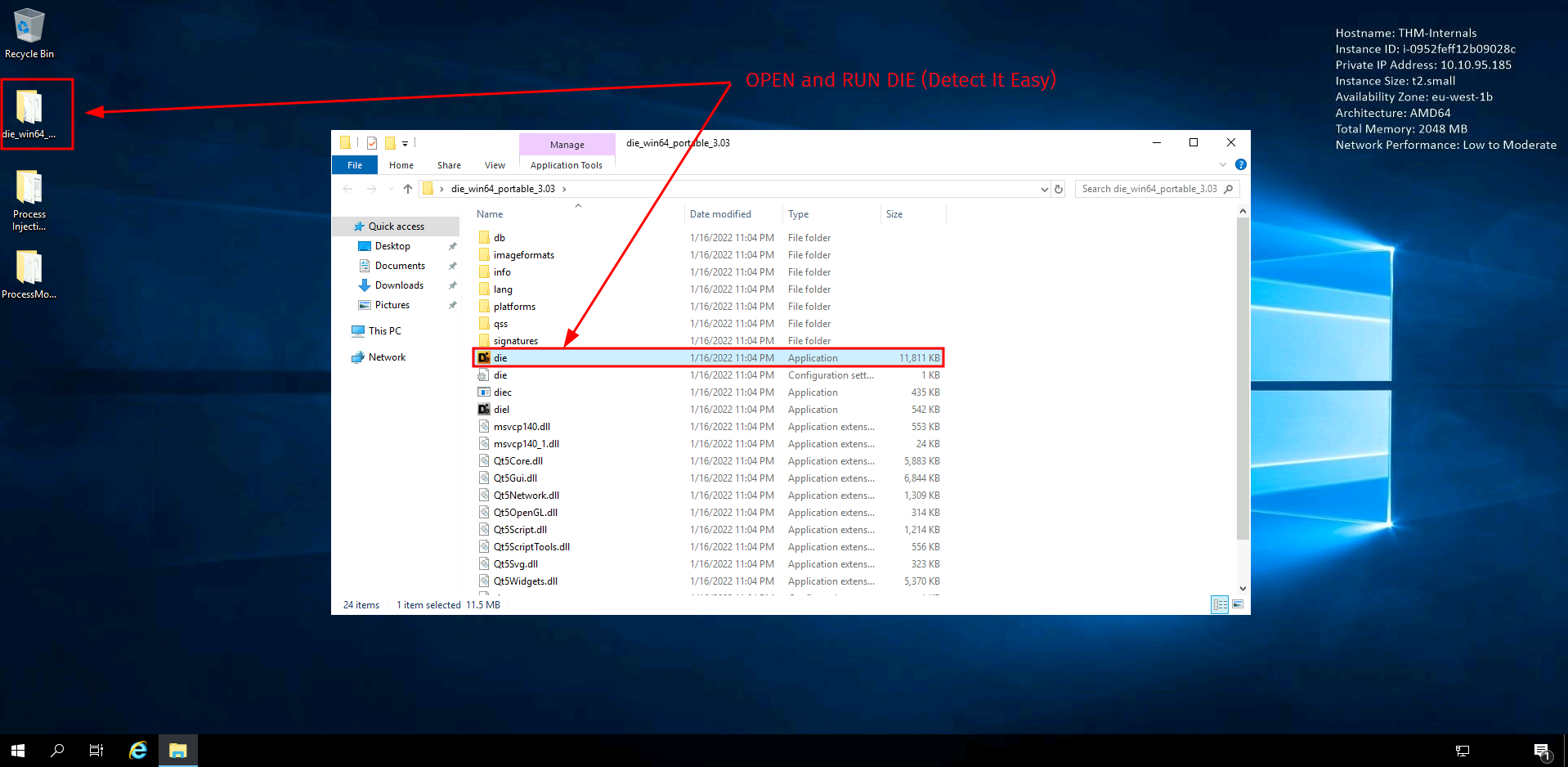 We start by opening up the "die_win64_..." Folder on our Desktop and running the "die" (Detect It Easy) Application.