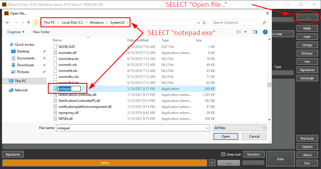 We follow up by opening the "notepad.exe" executable, by first clicking on "..." to open up a file, and then by selecting our executable which can be found at C:\Windows\System32\notepad.exe.