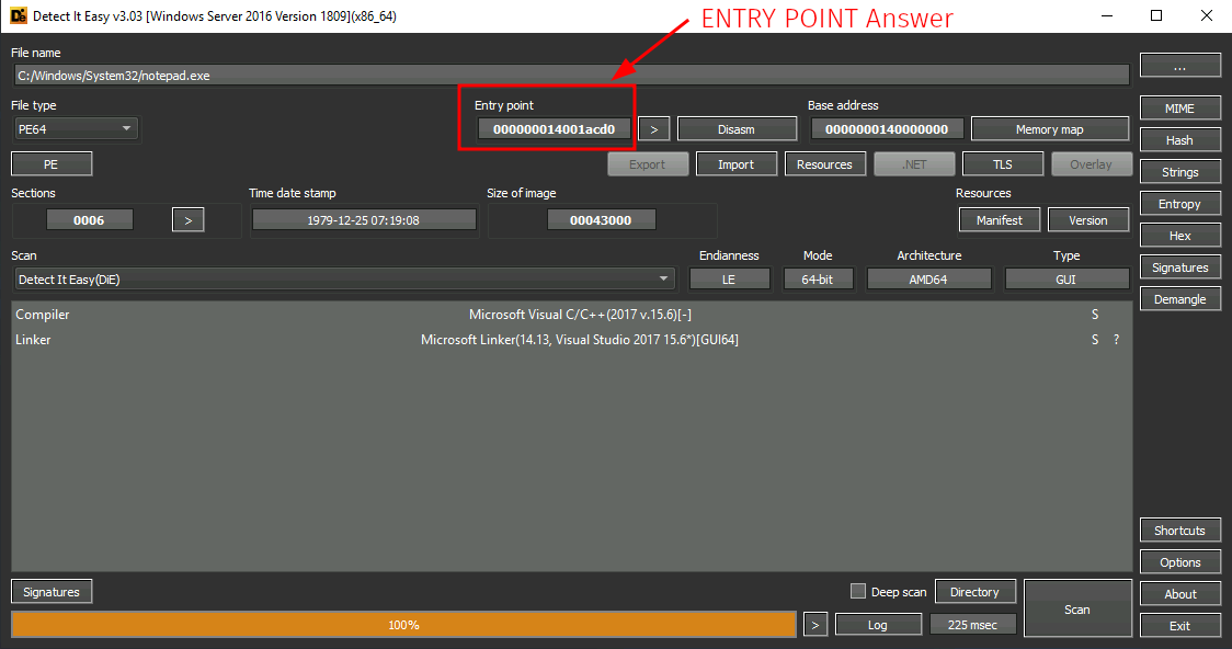 Question 3: Open "notepad.exe" in Detect It Easy and answer the questions below.