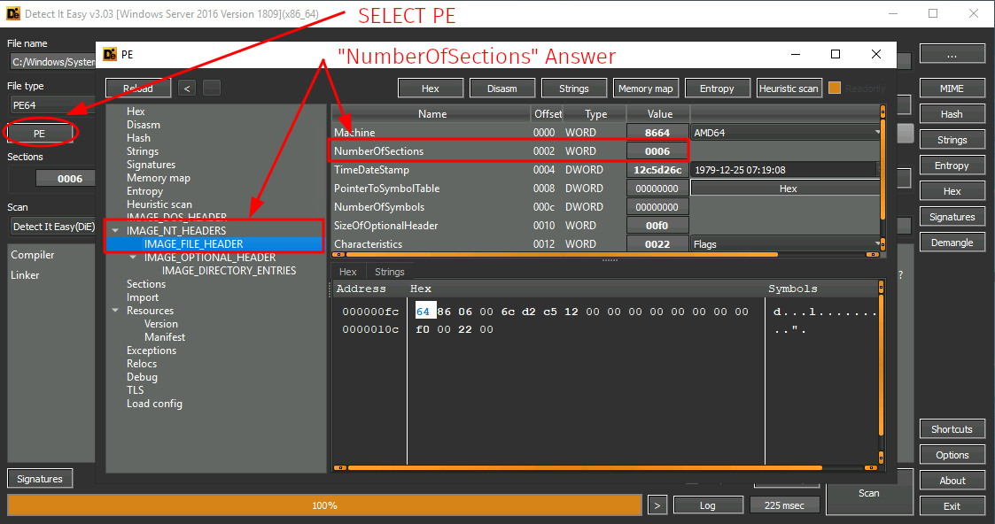 Click on "PE" and select "IMAGE_NT_HEADERS" > "IMAGE_FILE_HEADER" for the number of sections.