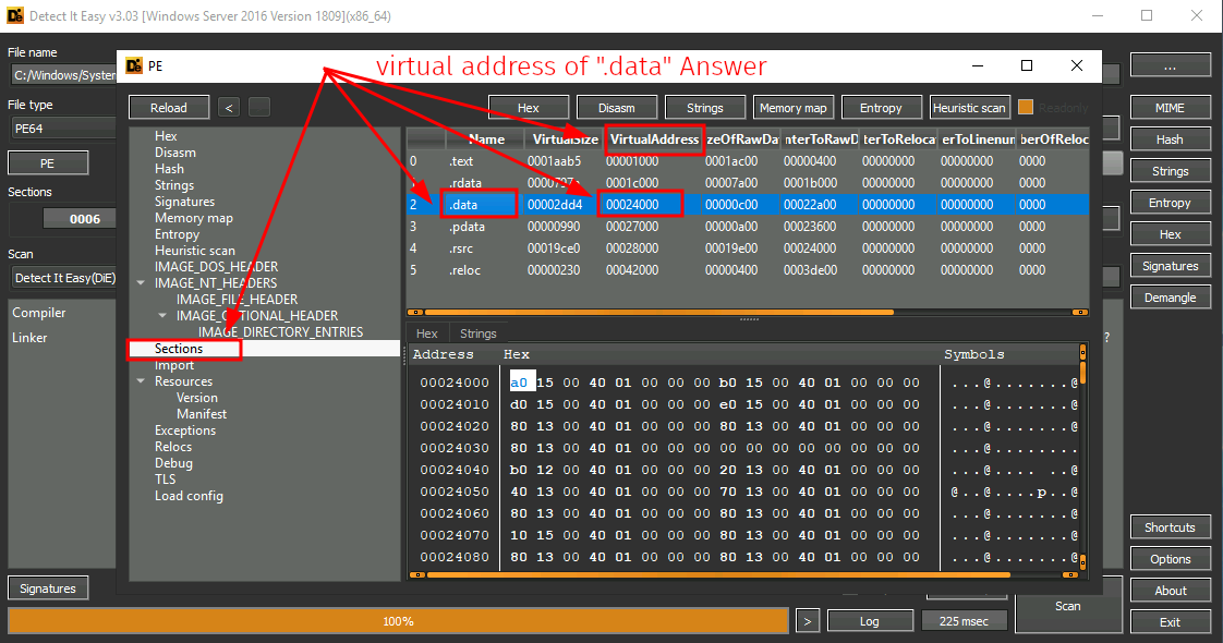 Still in "PE", select "Sections" to viev the ".data" section and it's properties.