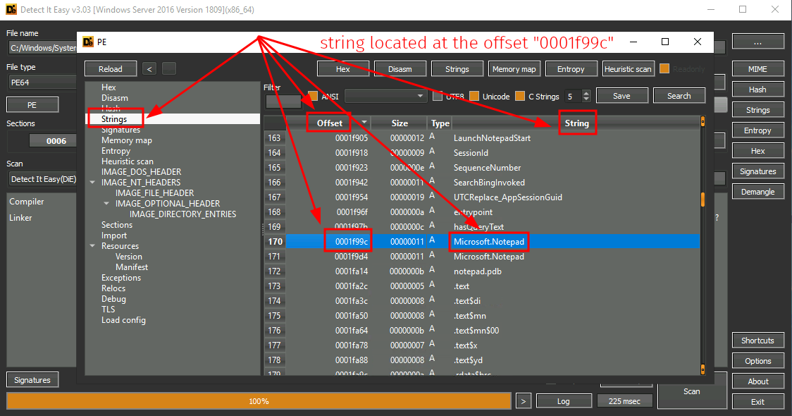 Lastly, still in "PE", select "Strings" and look for the matching offset value.