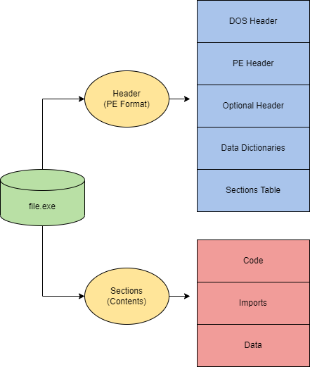 • PE File Header | defines the format of the file, contains the signature and image file header, and other information headers