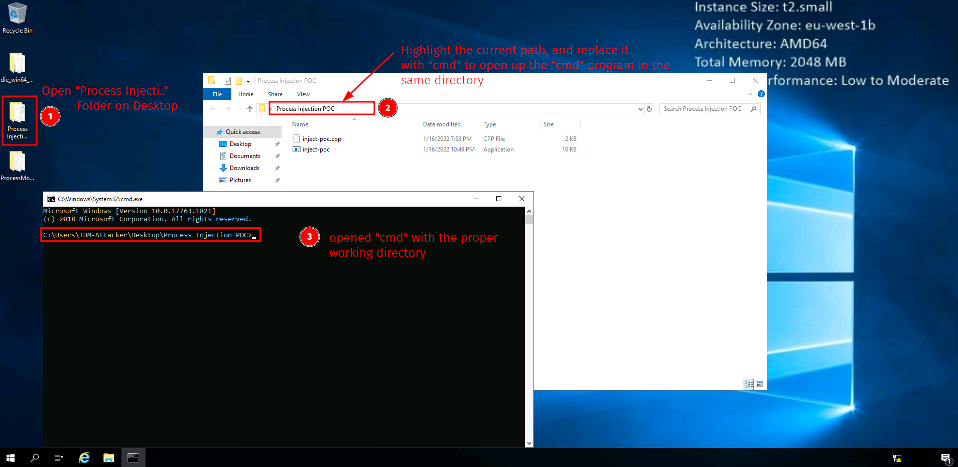 To open a command prompt within the proper working directore, we first open the "Process Injecti..." directory on our Desktop. Then, we click on (highlight) our current path and overwrite it with "cmd" which will open up the command promt in our desired destination.