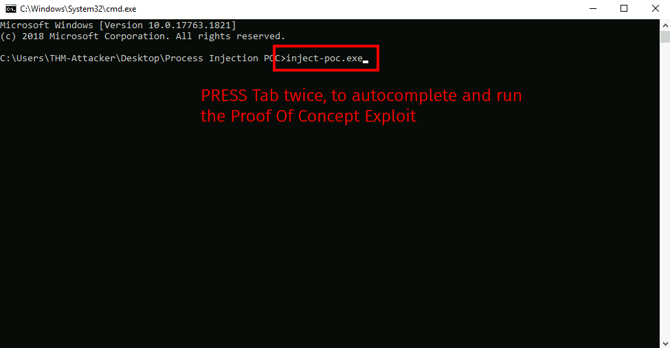 All we have to do now is to select the PoC executable and run it. Simply pressing Tab twice in cmd will autocomplete it for us, and we can simply run it by pressing Enter.