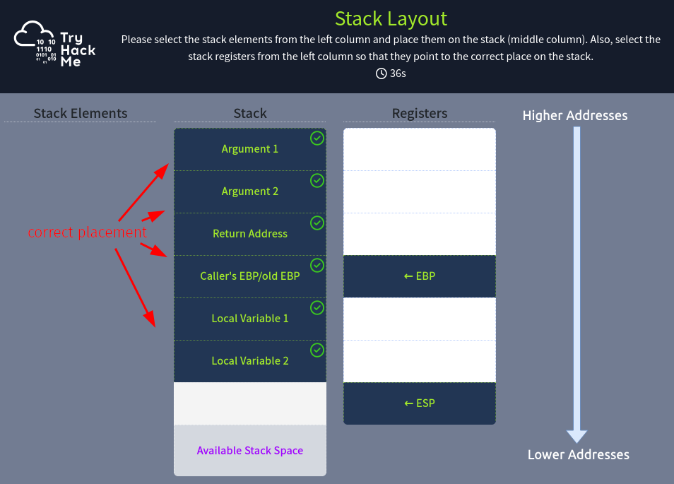- Function epilogue pops off the old base pointer, return address, and rearranges the stack pointers.