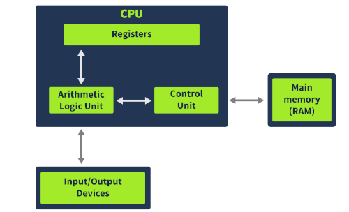 Here they explain the basic components of a CPU (Control Unit, Arithmetic Logic Unit, Registers) and how they interact with external devices (Memory, I/O devices). Here's a brief overview: