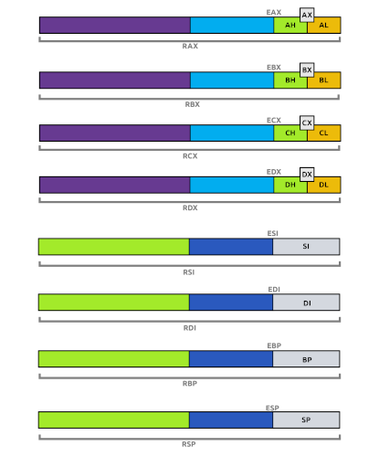 - EAX/RAX, EBX/RBX, ECX/RCX, EDX/RDX | Accumulator, Base, Counter, and Data Registers