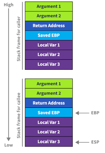 - The base pointer address changes to point to the top of the stack (the current stack pointer).